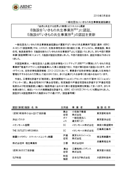 このたび、生物多様性保全に取り組む工場、オフィスビル、商業施設や集合住宅、戸建住宅、物流施設の8施設を「いきもの共生事業所R」として認証いたしました。また、5施設で認証を更新しました。